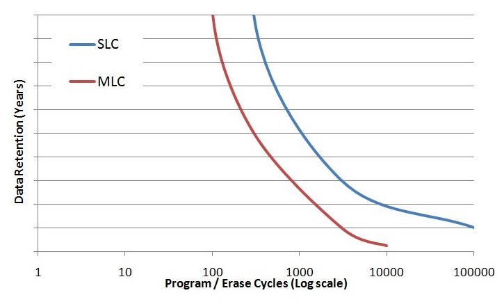 - Fakt ist auch, das SLC nativ zwischen 60.000 bis 100.000 Schreibzyklen verkraftet, während eMLC bis zu 30.000 Zyklen übersteht (write operations pro flash storage cell location); Consumer MLC verkraftet je nach Technologie-Implementierung zwischen 3.000 bis max. 10.000 P/E-Cycles. Damit besitzt SLC eine bis zu 30 x höhere Lebensdauer gegenüber MLC. Eine Anmerkung zur Datenintegrität: Die Bit-Error Rate bei MLC NAND Flash ist zwischen 10 - 100 Mal schlechter als bei SLC NAND Flash und degeneriert kontinuierlich bei allen weiteren Program/Erase – Zyklen (Quelle: Siehe unten bei Abb. 1).