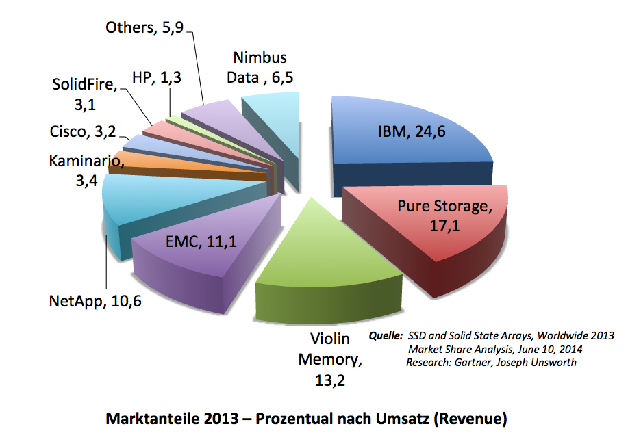 Abb.1 Quelle: Zahlenbasis nach Gartner (Table 4), "Top 10 - Worldwide Companies' Vendor Revenue From Shipments of SSAs, 10 June 2014" (weltweit für 2013).
