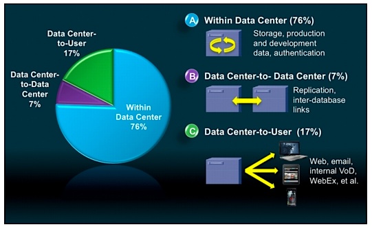 Erwartet wird eine Verdreifachung auf 7,7 Zettabyte. Etwa 17 Prozent davon werden von Privatnutzern erzeugt, die Internetseiten, Videostreams und soziale Netzwerke sowie mit dem Internet of Everything (IoE) verbundene Geräte nutzen. 76 Prozent kommen von Datenverschiebung innerhalb der Rechenzentren für Storage, Produktion und Entwicklung in virtualisierten Umgebungen. Die restlichen 7 Prozent entfallen auf den Verkehr zwischen Rechenzentren, etwa für Datenreplikation und Updates.