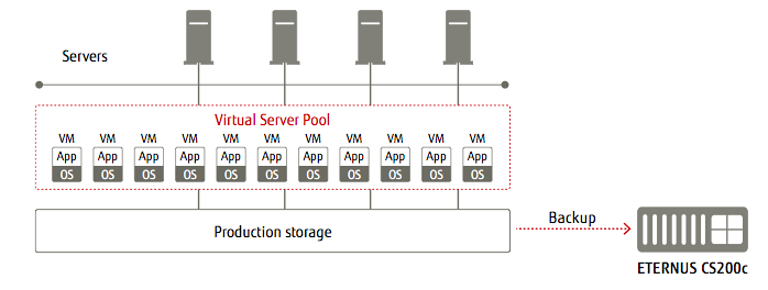 - ETERNUS CS200c wurde laut Hersteller konzipiert für kleine und mittlere Umgebungen zur Konsolidierung von Backup-Infrastrukturen, für Unternehmen mit Zweigstellen/Filialen und für einfache Backups in spezifischen Umgebungen wie MS Exchange und VM-Ware oder von Edge-Clients.