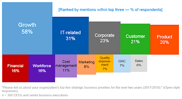 "An unsettled global political environment has not shifted CEOs' focus on profits and growth in 2017. Growth is the No. 1 business priority for 58 percent of CEOs, according to a recent survey* of 388 CEOs by Gartner, Inc. This is up from 42 percent in 2016.