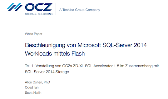 Zum Hintergrund: Datenbanken und Flash sind ein klassisches Anwendungsbeispiel für den Einsatz von high-performance Storage. Im folgenden Whitepaper der Firma OCZ (A Toshiba Group Company) wird beschrieben, wie mit Hilfe des aktuellen OCZ ZD-XL SQL Accelerator 1.5 im Rahmen einer hochintegrierten Hard-Software-Lösung SQL-Workloads kosteneffizient beschleunigt werden können. Als registriertem Benutzer unserer Webseite steht Ihnen das Original-Whitepaper übersetzt in deutscher Sprache frei zur Verfügung (siehe Rubrik Downloads).