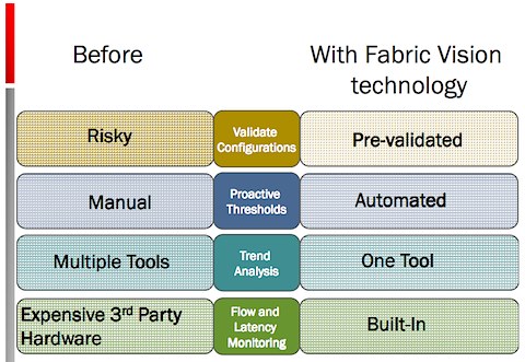 Fazit: Brocade's Fabric Vision-Technologie ist eine Hard- und Software-Lösung, die Funktionen von Brocade-Hardware, dem Embedded-Betriebssystem Brocade Fabric OS und der zugehörigen Verwaltungs-SW, dem Brocade Network Advisor vereint. Die Diagnostik-, Monitoring- und Management-Funktionen liefern Administratoren verschiedenste Möglichkeiten: so können Probleme antizipiert werden, bevor diese den Betrieb beeinträchtigen; außerdem kann die Bereitstellung von Anwendungen beschleunigt und Betriebskosten reduziert werden. Die Fabric Vision-Technologie umfasst im einzelnen: