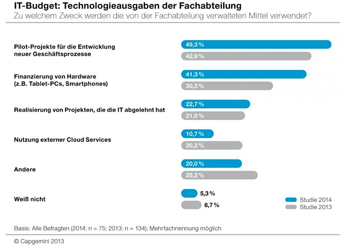 - Die Fachbereiche investieren nach wie vor in erster Linie in Pilot-Projekte zur Entwicklung neuer Geschäftsprozesse (49 Prozent) und kaufen neue Hardware wie beispielsweise Smartphones und Tablets ein (41 Prozent). Der ohnehin schon geringe Anteil externer Cloud Services, der von der Fachabteilung direkt bezahlt wird, ist von 20 Prozent im Vorjahr auf knapp 11 Prozent zurückgegangen.