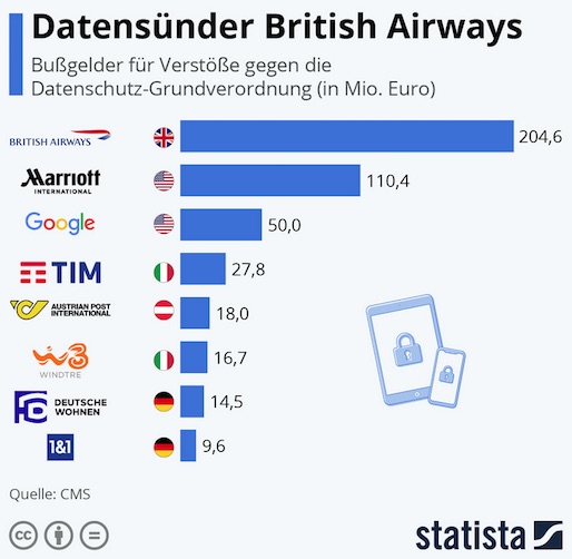 Im November letzten Jahres verhängte die Berliner Datenschutzbehörde ein Bußgeld in Höhe von 14,5 Millionen Euro gegen die Wohnungsgesellschaft Deutsche Wohnen, weil diese ein Archivsystem im Einsatz hatte, das keine Löschung persönlicher, nicht mehr benötigter Daten vorsah. Das bislang höchste Bußgeld hatte British Airways zu entrichten (siehe auch Abbildung unten): knapp 205 Millionen Euro wegen Verstöße gegen die Datenschutz-Grundverordnung, DSGVO.