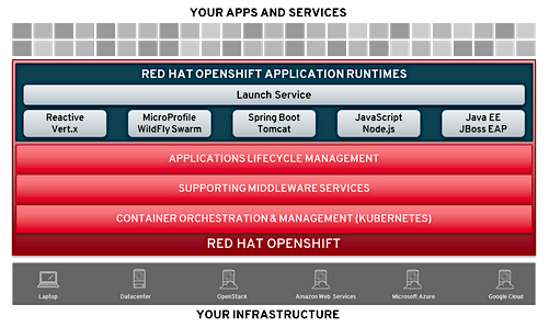 Red Hat OpenShift Application Runtimes stellt hierzu ein aufeinander abgestimmtes und unterstütztes Angebot für die Entwicklung von Microservices in mehreren Sprachen und Frameworks bereit (siehe Abb. 1 unten). Damit verfolgt Red Hat das Ziel (Zitat) "die Bedürfnisse der Entwickler nach Wahlmöglichkeiten mit den betrieblichen Anforderungen an Standardisierung und Support in Einklang zu bringen – sowohl bei der Erstellung neuer als auch bei der grundlegenden Überarbeitung vorhandener Applikationen". Laut einer Studie des Unternehmens von September 2017 gaben 87 Prozent der Befragten an, dass sie mehrere Runtimes und Frameworks für die Entwicklung von Microservices verwenden oder deren Einsatz prüfen. Red Hat OpenShift Application Runtimes unterstützt mehrere Runtimes, Programmiersprachen, Frameworks und Architekturen und zeichnet sich laut Entwicklerangaben durch folgende Funktionen-/Vorteile aus: