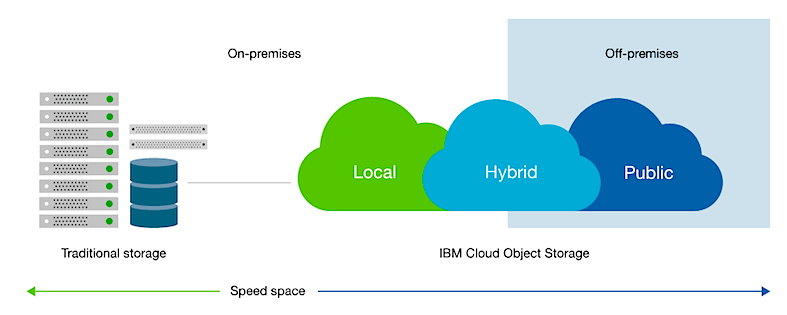 Während Unternehmen im Zuge der digitalen Transformation auf hybride Clouds setzen, hat nach Aussagen von IBM bis heute kein verhältnismäßiges Äquivalent für Cloud-Speicher existiert. Hier setzt der neue Cloud Object Storage Service an. Nach Angaben des Anbieters können andere Angebote am Markt bislang nur sog. "data slices" über verschiedene Systeme (on premises oder als cloud Deployments) übertragen, aber nicht über hybride Clouds. Das neue Angebot bietet eine logisch integrierte Datenspeicher-Plattform für alle gängigen Anforderungen (Block, File, Object) über on-premise und hybrid-/public Cloud Storage - Ressourcen (s.a. Abb. 1 unten).