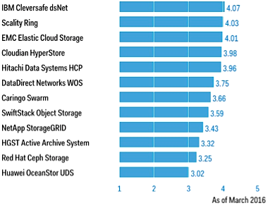 Vendors: Caringo Swarm, Cloudian HyperStore, DataDirect Networks WOS, EMC Elastic Cloud Storage, HGST Active Archive System, Hitachi Data Systems HCP, Huawei OceanStor UDS, IBM Cleversafe dsNet, NetApp StorageGRID, Red Hat Ceph Storage, Scality Ring, SwiftStack Object Storage."