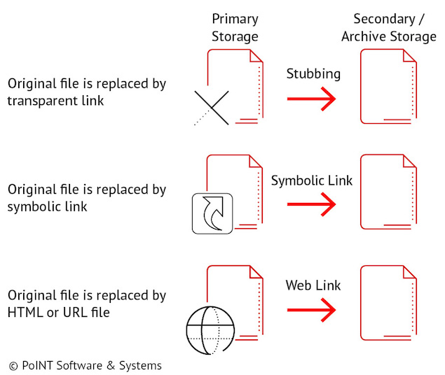 Entscheidend ist aber nicht nur, wie Daten verschoben bzw. archiviert werden, sondern insbesondere wie Anwender wieder auf sie zugreifen können. Da die bereits im PoINT Produkt verfügbare transparente Verlinkung, das sogenannte Stubbing, von der Unterstützung des Primärspeichers abhängt, bietet die neue Version des PoINT Storage Manager mit der Unterstützung von Symbolic Links eine weitere Methode, die praktisch für alle NAS-Systeme verwendet werden kann. Zusammen mit den Web-Links (URL- bzw. HTML-Dateien) und dem Browser-basierten Zugriff hat der Administrator die Möglichkeit, die Methode zu nutzen, die für seine Speicherinfrastruktur am besten geeignet ist.