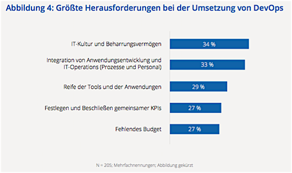 Abb. 1: Auf dem Weg zur erfolgreichen Umsetzung eines DevOps-Modells sehen Unternehmen noch Herausforderungen wie beispielweise die IT-Kultur (Bildquelle: IDC Multi-Client-Projekt, DEVOPS IN DEUTSCHLAND 2020. Erfolgreiche Business Transformation mit agiler IT, Microservices und DevOps).