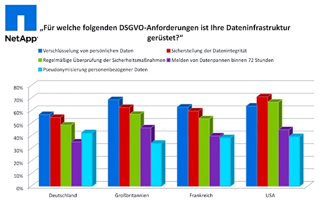 Abb. 1: Im internationalen Vergleich sind deutsche Unternehmen am wenigsten für wichtige DSGVO-Anforderungen gerüstet (Quelle: NetApp)