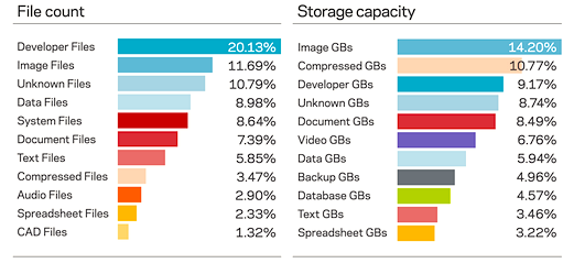 Verwaiste Daten haben keinen aktuellen „Eigentümer“. Dieser hat entweder seine Rolle im Unternehmen gewechselt oder hat es verlassen. Unternehmen verlieren diese Daten oftmals aus dem Sinn, sie kosten aber viel Geld. Der Index zeigt, dass verwaiste Daten oft Videos, Bilder und Präsentationen sind – reichhaltige Inhalte, die eigentlich nicht unbeachtet bleiben sollten. Sie nehmen zudem einen hohen Anteil an Speicherplatz ein - und zwar über 200 Prozent mehr, bezogen auf die gezählte Anzahl der gesamten Dateien.