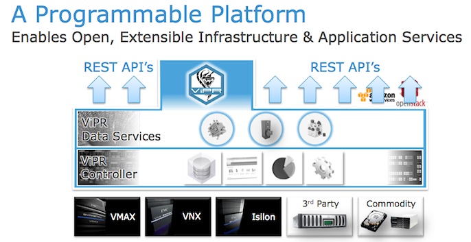 Zur Funktionsweise: Ähnlich Software Defined Networks (SDN) mittels Control-Plane und Service-Layer verwaltet ViPR als Software-Defined Storage Platform die Speicherinfrastruktur (Kontrollschicht) und die Daten (Block, File) innerhalb dieser Infrastruktur (Datenschicht); EMC ViPR ist laut Hersteller vollständig Software-basiert implementiert.