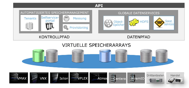 - EMC ViPR Software-Defined Storage Platform verwaltet die Speicherinfrastruktur (Kontrollebene) und die Daten innerhalb dieser Infrastruktur (Datenebene)