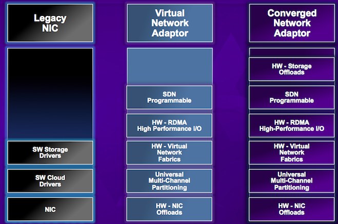 Entwickelt für hochgradig virtualisierte Umgebungen: Die OCe14000 Adapters arbeiten mit Hardware Offload-Engines zur Optimierung des Overheads bei virtual Networking. Erreicht wird laut Anbieter eine bis zu 50-prozentige Verbesserung der CPU-Auslastung im Vergleich zu üblichen NICs z.B. beim Einsatz im Rahmen einer VMware VirtualWire-Verbindung... Resultat: es werden mehr VMs pro Server unterstützt. Ferner ermöglicht der OCe14000 Adapter eine bis zu vierfache Leistungsverbesserung bei der Small Packet Network Performance, wie sie zur Skalierung transaktions-intensiver oder geclusterter Anwendungen erforderlich ist.