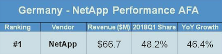 Der deutsche und der französische Markt zeigten aufgrund des gestiegenen Geschäftsklimas zu Beginn des Jahres weiterhin ein starkes Wachstum. NetApp hat hierzu am 20. Juni bekanntgegeben, dass das Unternehmen laut dem IDC Quarterly Enterprise Systems Storage Tracker, Final data Q1CY18, June 2018 in puncto Marktanteil in Deutschland die Nr. 1 bei All-Flash Arrays (External), Enterprise Storage (External SAN) und Enterprise Storage (External NAS & SAN) ist (siehe Anlage unten).