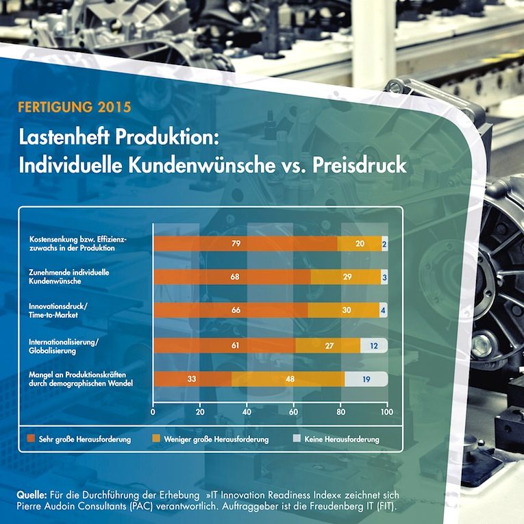 Hinzu kommt der Fachkräftemangel in der Produktion aufgrund des demografischen Wandels: Rund 33 Prozent der Studienteilnehmer nannten dies 2014 eine „sehr große Herausforderung“.