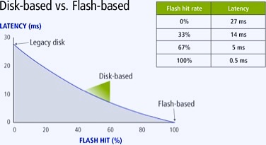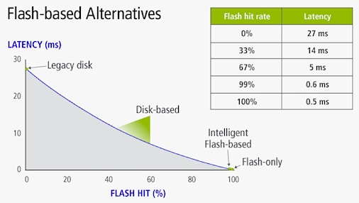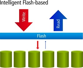 Abb. 4: Bei intelligenten Flash-basierten Produkten kommt eine Kombination aus Flash- und Festplattenspeicher zum Einsatz, um eine Flash-Zugriffsrate von 99 % zu erreichen und so effizienter als reine Flash-Arrays eine Leistung im Sub-Millisekunden-Bereich zu erzielen