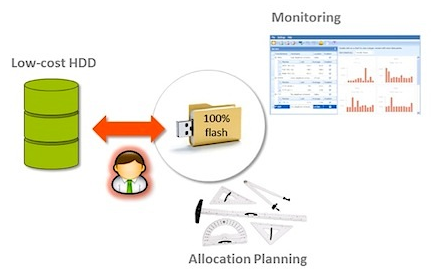 Dazu werden unnötige Daten aus dem Flashspeicher entfernt und nur wichtige Daten dort belassen. Bei den aus dem Flash-Speicher entfernten Daten handelt es sich vor allem um Snapshots, Replikate, nicht genutzte Anwendungen, ausgeschaltete VMs und andere äußerst selten benötigte Daten. Anders als bei reinen Flash-Produkten kann so der nutzbaren Flash-Speicher zu 100 % gefüllt werden, ohne befürchten zu müssen, dass der Speicherplatz knapp wird.