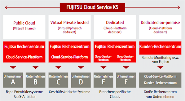 - Mit dem Cloud Service K5 bietet Fujitsu eine Plattform für Public und Virtual Private Clouds. Weitere Bereitstellungsmodelle machen den Fujitsu Cloud Service K5 auch als Private Cloud verfügbar, die sowohl in den Rechenzentren von Fujitsu als auch beim Kunden vor Ort betrieben werden kann. Dabei soll immer die Kompabilität mit vorhandenen Infrastrukturen und Applikationen gegeben sein. So können Kunden flexibel das für sie optimale Modell und die Geschwindigkeit der Implementierung bestimmen.