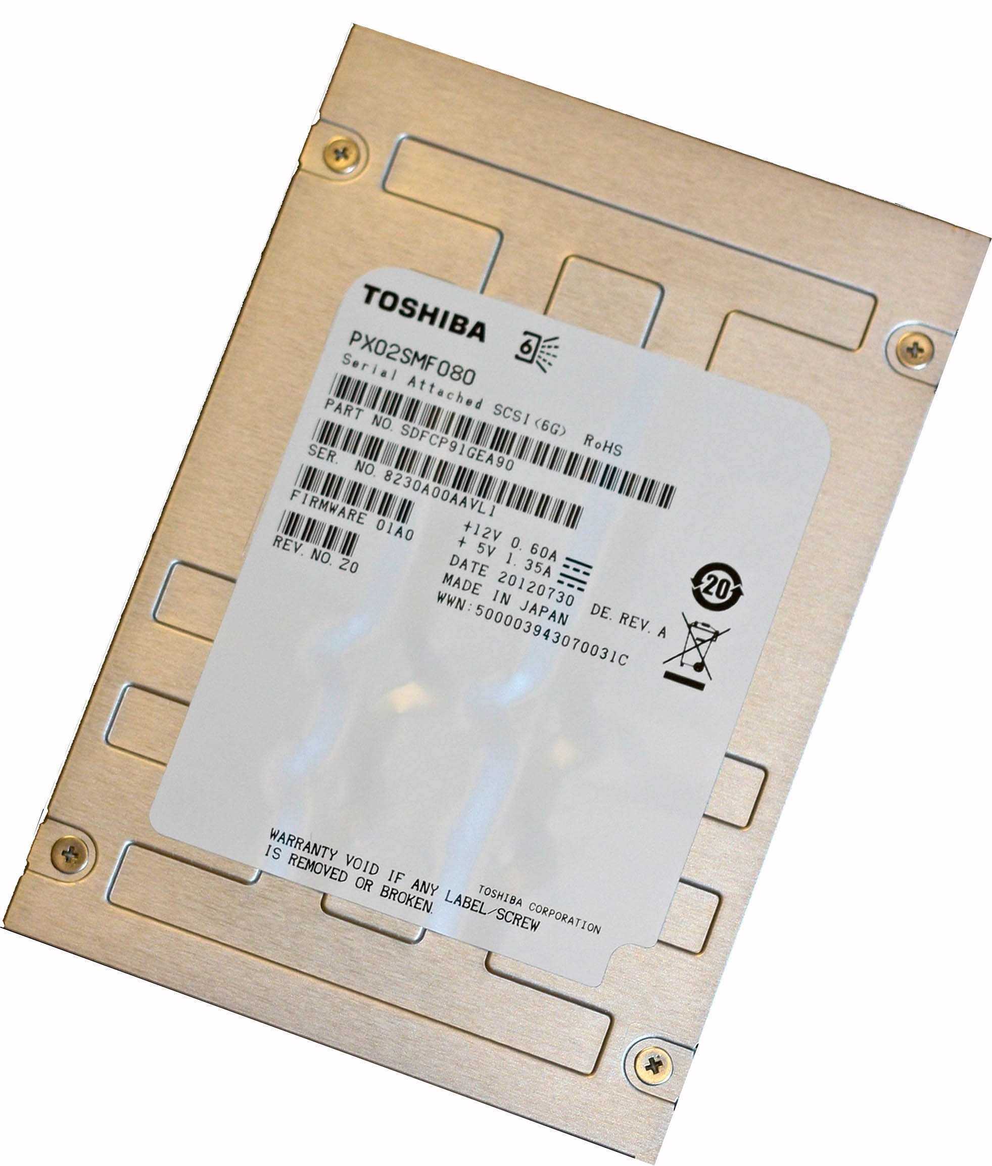 Abbildung 2: In der PX02SM-Serie bietet Toshiba eSSDs mit NAND-Technologie an, die auf einer kosteneffizienten – im 24-Nanometer-Fertigungsverfahren produzierten – Enterprise Multi-Level Cell (eMLC) basieren. Die eSSDs verfügen über Speicherkapazitäten von 200, 400, 800 GB oder 1,6 TB und Übertragungsraten von bis zu 12 Gbit/s mit einer Dual-Port-SAS-Schnittstelle.