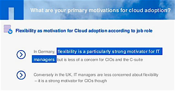 Sicherheit und Cloud passen gut zusammen: Für mehr als die Hälfte der Befragten - 56 Prozent - ist Sicherheit ein Hauptbeweggrund für den Cloud-Einsatz. Deutschland, Frankreich und UK platzieren diesen Aspekt übereinstimmend unter den Top 3 der Cloud-Nutzungsgründe. Daten Cloud-Anbietern anzuvertrauen, wird nicht als Sicherheitsrisiko wahrgenommen - woraus sich eine weiter ansteigende Cloud-Verbreitung ableiten lässt. Alle drei Länder setzen außerdem Flexibilität (55 Prozent) und Kosteneinsparungen (54 Prozent) weit oben auf die Liste der Motivationsgründe für den Cloud-Einsatz. In Frankreich (61 Prozent) und in UK (50 Prozent) wird die einfache Handhabung als ein Hauptgrund angesehen, anders als in Deutschland (46 Prozent): Hier führen die Befragten häufig Datenschutz (53 Prozent) an.