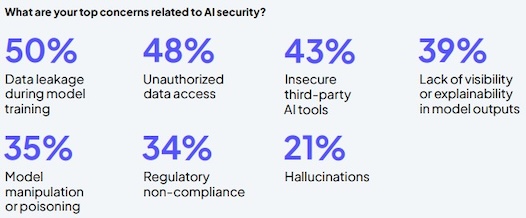 Integration von KI und Sicherheitsbedenken: Genau die Hälfte der Befragten gab an, dass Datenverluste während des Modelltrainings eine Sorge im Zusammenhang mit der KI-Sicherheit darstellen, 48 Prozent nannten den unbefugten Datenzugriff und 43 Prozent unsichere KI-Tools von Drittanbietern. Trotz dieser Bedenken sind die Unternehmen zuversichtlich, die in KI-Systemen verwendeten Daten zu sichern.