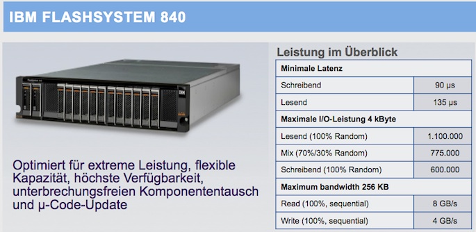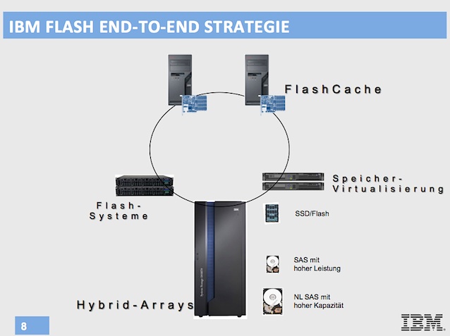 Das Storage Portfolio von IBM umfasst demnach verschiedenste Flash-Systeme und Lösungen, darunter das FlashSystem 840, FlashSystem V840 All-Flash-Arrays sowie die DS8000- und Storwize V7000-Familien Speicher-Systeme, die als All-Disk-, All-Flash- oder hybride (Disk- und Flash-)Systeme konfiguriert werden können. IBM's XIV Speicher-System unterstützt derzeit bis 12 Terabyte Flash-Cache.