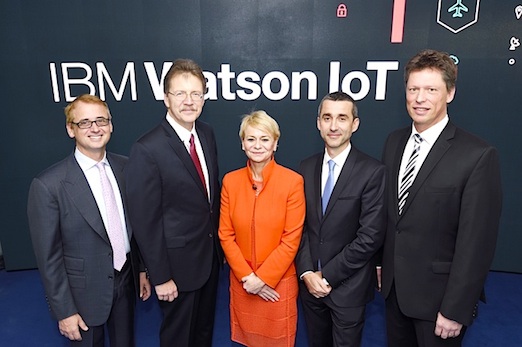 Abb. 1: Bildquelle IBM / Opening of the IBM Watson IoT Center in Munich. From left to right: David Kenny, Chairman & CEO of The Weather Company; Dr. John E. Kelly, Senior Vice President, Solutions Portfolio and Research, IBM; Harriet Green, General Manager, Watson IoT and Education, IBM; Laurent Martinez, Head of Business Unit "Services by Airbus" at Airbus and Matthias Rebellius, CEO of Siemens Building Technologies / Copyright by IBM.