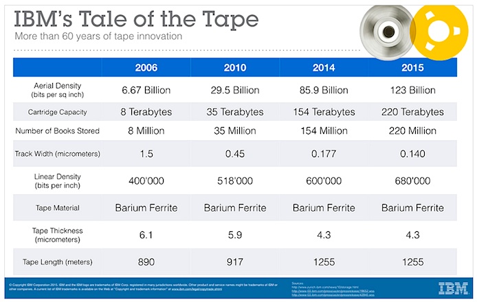 Zum Hintergrund: Wissenschaftler von IBM Research in Zürich haben in Zusammenarbeit mit dem japanischen Unternehmen FUJIFILM erstmals Daten mit einer Speicherdichte von 123 Gigabits pro Quadratzoll (rund 6,45 cm2) auf einem Barium-Ferrit-Magnetband gespeichert. Mit der neuen Technologie könnte laut Hersteller demnach eine einzelne Linear Tape Open-Kassette (LTO) 220 Terabyte an unkomprimierten Daten speichern. Dies entspräche der 88-fachen Kapazität einer heutigen Bandspeicherkassette des Industriestandards LTO6 oder einer 22-fachen Steigerung gegenüber dem neuesten IBM Tape-Produkt.