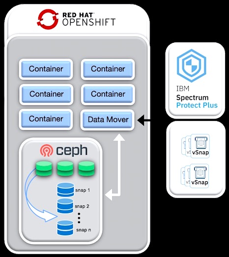 Entwickler sind mit IBM Spectrum Protect Plus in der Lage, persistente Container-Volumes mithilfe vordefinierter Richtlinien, nativer Kubernetes-Integration und CSI-Snapshots zu sichern und wiederherstellen. IBM Spectrum Protect Plus liefert Snapshots von persistenten Ceph-Speichervolumina über das Container Storage Interface (CSI) und nutzt die Kubernetes-Orchestrierung zur Automatisierung der Backup-Planung.