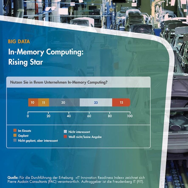 - Gemäß Studie nutzen derzeit 10 Prozent der fertigenden Unternehmen in Deutschland In-Memory Computing, 11 Prozent planen dies und 30 Prozent sind interessiert. Dies ergibt eine knappe Mehrheit, die dem Thema positiv gegenübersteht. Ein Drittel besitzt kein Interesse, der Rest macht keine Angabe (siehe auch Grafik am Textende).