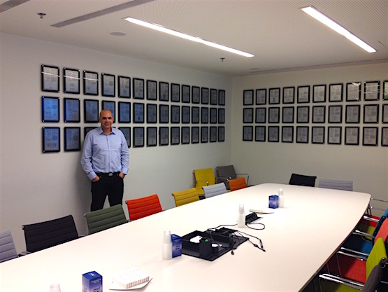 Abb. 2: Das Foto zeigt Moshe Rivel, Senior Director of Tech Sales EMEA & APJ Infinidat, vor Unternehmenspatenten im zentralen Besprechungsraum (Bildquelle: Storage Consortium, Dez. 2017).