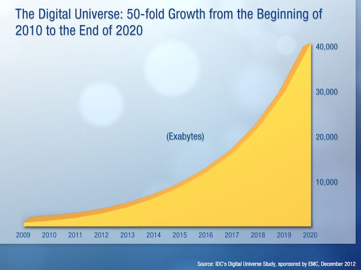 Diese Entwicklung hat dazu geführt, dass sich das digitale Universum in den letzten zwei Jahren auf 2,8 Zettabyte verdoppelt hat (in nur acht Jahren soll das digitale Universum auf 40 Zettabyte anwachsen, prognostiziert IDC. Anders betrachtet: Im Jahr 2020 wird jeder Mensch im Schnitt jährlich etwa 5.247 Gigabyte zum digitalen Universum beitragen).