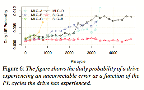 Die Standard-Metrik, um Flash-Zuverlässigkeit zu bewerten, ist die sog. Roh-Bitfehler-Rate (RBER). Sie wird als die Anzahl von beschädigten Bits pro Anzahl gegenüber der in Summe gelesenen Bits definiert. Der Unterschied von RBER für MLC-Laufwerke liegt zwar um Größenordnungen höher als bei den verwendeten SLC-Modellen - und deshalb gibt es diesen Preisunterschied, aber: im Rechenzentrumsbetrieb scheint die Metrik RBER nicht mit der Anzahl von nicht-korrigierbaren Fehlern (UE) zu korrelieren.