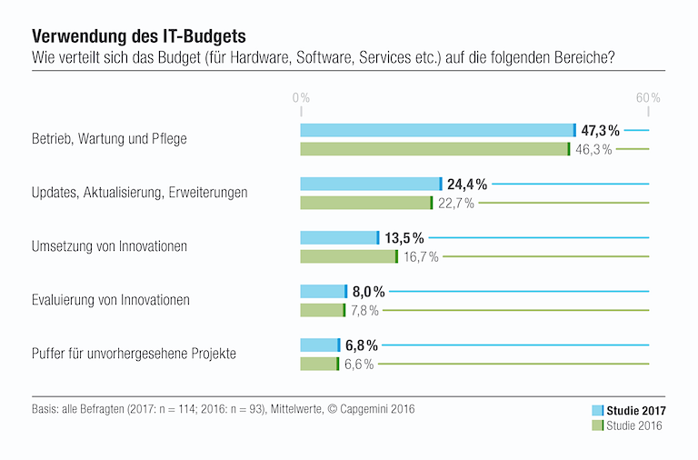 Diese Ausgaben gehen im Moment offenbar zu Lasten von Innovationsprojekten der IT-Abteilung. Insgesamt wird sie 2017 nur noch 21,5 Prozent für die Evaluierung und Umsetzung ausgeben, im laufenden Jahr waren es noch 24,5 Prozent.
