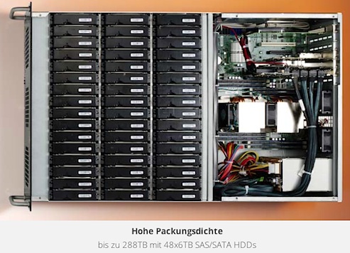- „BigFoot Storage XXLarge“ ist laut Anbieter besonders für Backup, Speicherplatz für Webdrives, Log-Daten sowie die Handhabung großer Datensätze geeignet. Die Gesamtlösung für Server und Storage liefert bis zu 288 TB und kann nach Bedarf um zusätzlichen Speicherplatz erweitert werden.