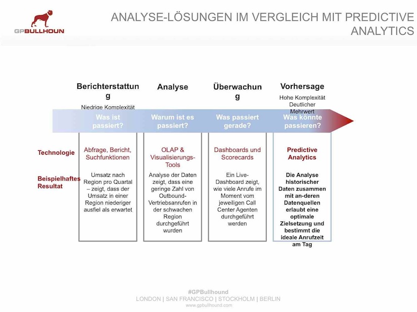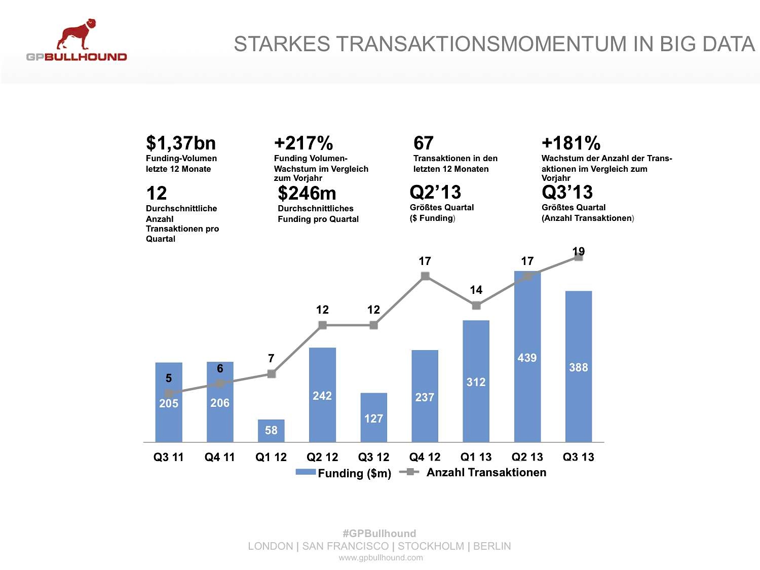 Zum Hintergrund: der „Exabytes Research Report“ der internationalen Technologie-Investmentbank GP Bullhound (http://www.gpbullhound.com) zeigt, warum Investmentaktivitäten in diesem Bereich aktuell in die Höhe schnellen. Anhand von 30 Interviews mit Technologieanbietern, Investoren und Kunden gibt die Studie Aufschluss über Entwicklungen auf dem Big Data Markt. Danach ist das Segment Big Data Analytics nicht nur eines der gefragtesten im Technologiebereich, sondern eines der wachstumsstärksten. Das dritte Quartal verzeichnete sogar das bisher größte Transaktionsvolumen.