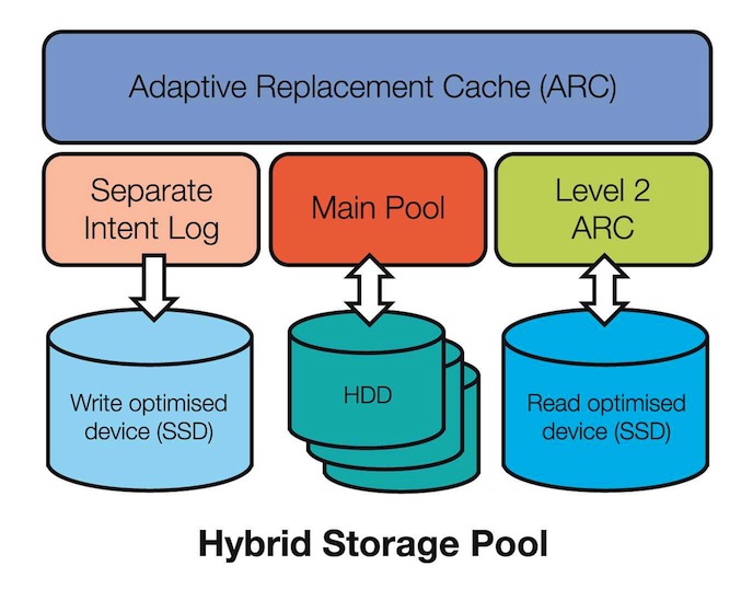 Ähnlich wie beim Lesen funktioniert der Hybrid Storage Pool auch beim Schreiben. ZFS handhabt mittels Caching die synchronen Schreibvorgänge verschiedener Protokolle (beispielsweise NFS, SMB/CIFS). Die Schreibvorgänge werden im das ZFS Intent Log (ZIL) protokolliert, bis sie an nicht-volatilen Stellen im Speicher abgelegt sind.