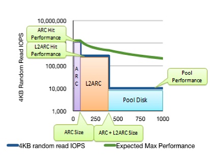 ARC, L2ARC und ZIL bestimmen im Wesentlichen die Leistung innerhalb eines ZFS Hybrid Storage Pools, da nur sehr wenige Datenzugriffe auf die dahinter liegenden Fest-platten erfolgen. Somit können Festplatten dafür eingesetzt werden, wofür sie am besten geeignet sind: Günstige Speicherkapazität mit hoher Dichte. Eine Balance zu finden zwischen DRAM und Flash für die Performance einerseits und HDDs für die Kapazität andererseits, ist über die Gesamtlaufzeit des Systems gesehen effizienter, als nur Flash und Festplatten zu nutzen. Dies wird so lange gelten, bis Flash und Festplatten auf dem gleichen Preisniveau angekommen sind.