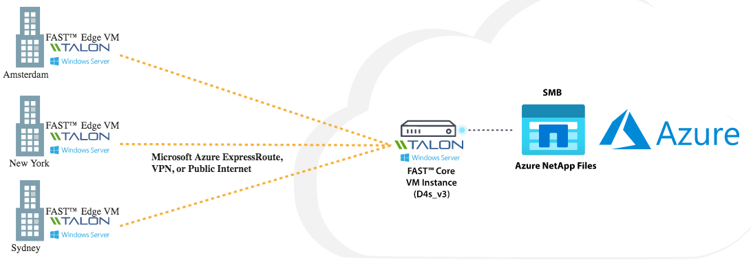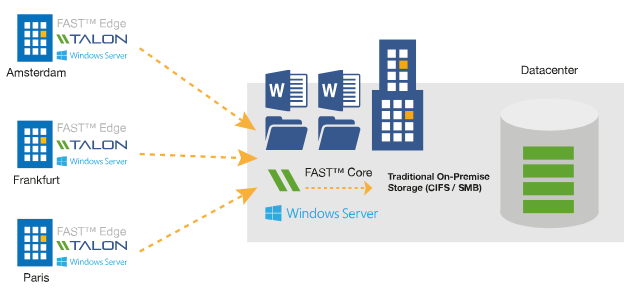 Die Abbildung zeigt, wie Talon FAST™ den bestehenden Backend-Storage und die Infrastruktur "überdeckt" und den On-Premise-Storage wie z.B. NetApp AFF/FAS, der File-Shares hostet, transparent auf die verteilten Zweigstellenstandorte ausdehnt.