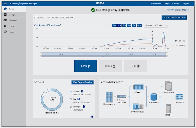 Abb.: SANtricity System Manager Dashboard (Bildquelle: NetApp). Die SANtricity Software mit Performance-Optimierung stellt Informationen für Datenanalyse-, Videoüberwachungs- und Backup-Applikationen bereit.