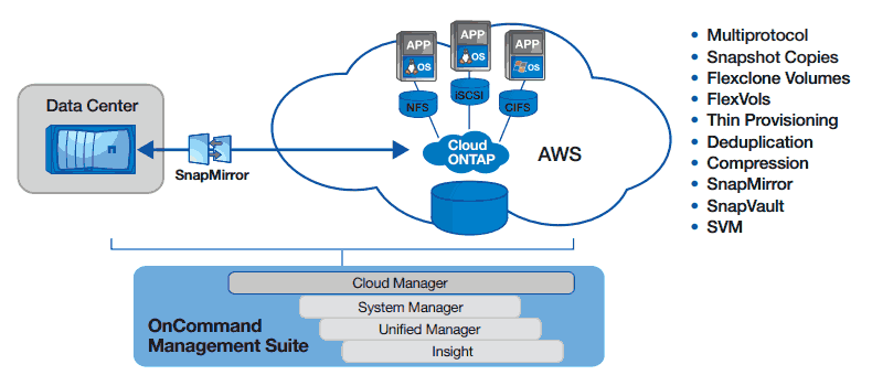 Cloud ONTAP bringt Clustered Data ONTAP als Software Defined Storage in vollem Funktionsumfang in die Public Cloud. AWS ist der erste Plattform-Provider, der in seiner Cloud-Umgebung mit den neuen Cloud ONTAP Data Services arbeitet (laut IDC ist ONTAP derzeit weltweit das #1 Storage Betriebssystem (Quellenangabe Textende). In der ersten Version wird die virtualisierte Software-Instanz von Clustered Data ONTAP 8.3 mit der Skalierbarkeit von Amazon Web Services (AWS) kombiniert verfügbar.
