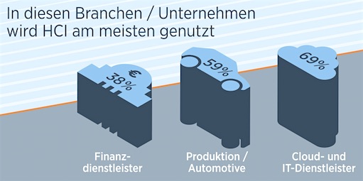 Der Blick fünf Jahre voraus veranschaulicht Verschiebungen, wo sich der Nutzungsbedarf verorten lässt. Für die IT-Branchenkenner bleiben die IT- und Provider-Kollegen die stärkste Anwendergruppe (59 Prozent). Der Bereich „Produktion/Automotive" festigt den Rang dahinter (58 Prozent). Insbesondere auch die Finanzdienstleister (42 Prozent) werden künftig auf die HCI setzen, schätzen die Experten.