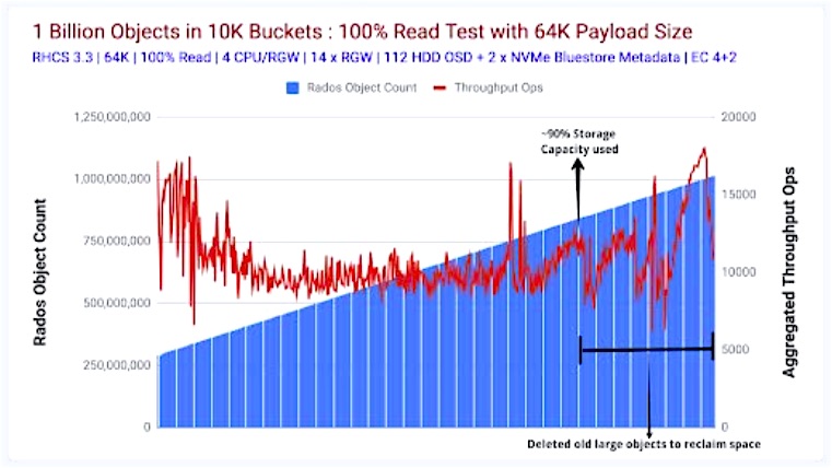 Hinweis: Abbildung 18 stellt die Leseleistung gemessen in der aggregierten Durchsatzmetrik (OPS) dar. Grundlage ist die Aufnahme (Schreiboperationen) von 1 Milliarde 64K-Objekten im Ceph-Cluster über Amazon S3. Der Test begann laut Entwickler mit etwa 290 Millionen Objekten, die bereits im Ceph-Cluster gespeichert waren. Mehr dazu im PDF Whitepaper von Red Hat / Dell EMC).