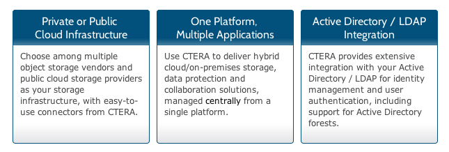 - CTERAs Plattform kombiniert Datensicherung und -schutz, Synchronisation, das Teilen von Unternehmensdateien sowie NAS-Services für Remote-Offices/Zweigstellen (ROBO) in einem Paket.