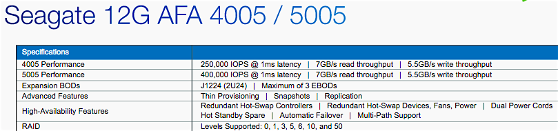 Abb. 1 & 2: Leistungsdaten - Seagate RealStor All Flash Array (AFA) 4005 / Hybrid Array 5005 (Bildquelle: Hersteller)