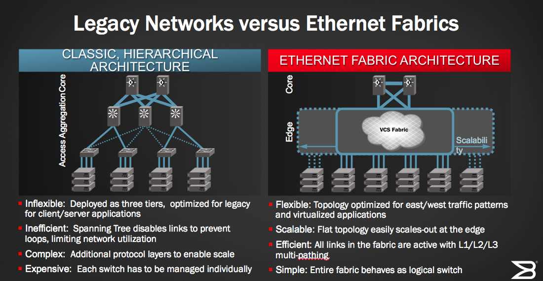 - Reduzierung von Komplexität und Automatisierung im RZ: Ethernet Fabrics auf Basis der Brocade VCS Fabric-Technologie sind speziell für hoch-virtualisierte Umgebungen ausgelegt und ermöglichen die schnellere Bereitstellung von Anwendungen ebenso wie eine schnelle Migrationen virtueller Maschinen (VMs) ohne manuelle Eingriffe.. Mit VCS Fabrics lassen sich dutzende Switches als ein logisches Gerät verwalten, was direkt die Betriebskosten reduziert. Ferner reduziert sich Installationszeit, da sich neue Switches selbst konfigurieren, sobald sie in die Fabric eingebunden wurden.