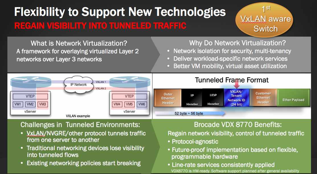 - Das mit einer 4-Tb/s-Backplane ausgestattete Brocade VDX 8770-Gehäuse ist bereits darauf ausgelegt, High Density 100 GbE aufzunehmen und damit ausreichend Performance-Kapazität auch für die kommenden Jahre bereitzustellen (kein Technologiewechsel des gesamten Rahmens, aka Forklift-Upgrade…). Das Gerät ist auch für den Einsatz in Software-Defined Networking (SDN)-Architekturen geeignet, da er flexible Hardware-Unterstützung für die Netzwerk-Virtualisierung mit Technologien wie VXLAN Overlay Networking bietet. Weitere Infos unter: