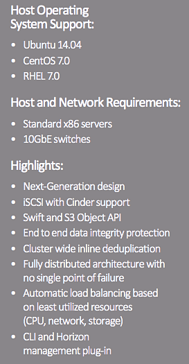 - Horizontal skalierbare Speicherlösung mit iSCSI-Blockspeicherung mit geringer Latenz und leistungsstarken Swift- und S3- Objektservices (open Stack Block Storage Cinder, Swift and S3 APIs for OpenStack)